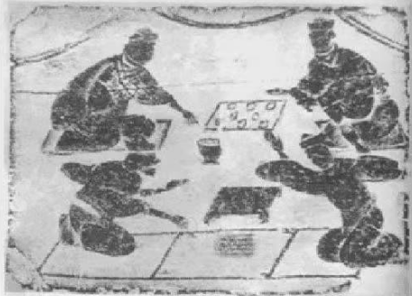图中有一案,案上有耳杯、一盂,大概在进行对博饮茶。