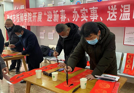 山东新闻网:(刘延栋 吕英杰)春节是中华民族祈福迎祥的传统节日,贴春联则是中国人过春节的文化传统之一,写春联,送喜庆,更是弘扬中华民族优秀传统文化的良好形式。1月29日,山东省聊城市市直书画家协会技师学院分会的几名书法家与聊城市技师学院工会的领导们一起来到九州国际社区和金柱东苑小区开展了“迎新春,办实事,送温暖”主题活动,希望通过这种形式,让更多群众感受春联的魅力,营造新春喜庆祥和的气氛。