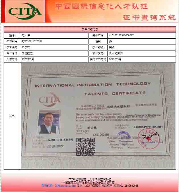 时大伟:1978戊午年出生于老子故里河南鹿邑,当代知名的传统文化学者,中国建筑环境堪舆师,中华当代知名的易学名家,现任中华传统文化茅山论坛常务理事,中华传统文化西湖论坛副秘书长,北京乾坤学院名誉院长,中华传统文化发展应用东莞论坛副主席,北京大道乾坤环境科学技术院名誉主席兼学术专家组成员。近日他又获得中国国际工业信息化协会人才认证办公室高级道学能量师专业技能资格认证证书。