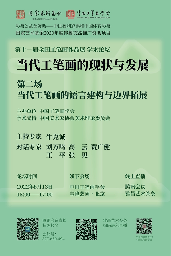 2022年8月13日下午,由中国工笔画学会主办、中国美术家协会美术理论委员会学术支持的,国家艺术基金资助项目“第十一届全国工笔画作品展”系列论坛“当代工笔画的现状与发展”第二场“当代工笔画的语言建构与边界拓展”,在中国工笔画学会成功举行。六位嘉宾结合“第十一届全国工笔画作品展”,就当代工笔的语言探索、工笔传统的当代价值、当代工笔的跨界融合、当代工笔的精神意蕴等大家关注的话题展开精彩对话。论坛合作的雅昌艺术头条直播吸引了近36万观众在线观看直播和回放。