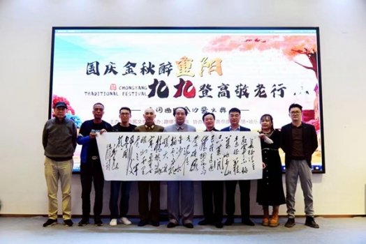 著名毛体书法家张安全现场泼墨,书写伟人诗词《长征》和《采桑子•重阳》,庆祝祖国73岁生日和重阳敬老情。国家著名导演胡庚辰对《长征》这首诗的创作背景作了详细介绍,学诗词不仅要理解文字的含义,更要了解作者当时的创作背景,才能明白诗词家做的本身意义。