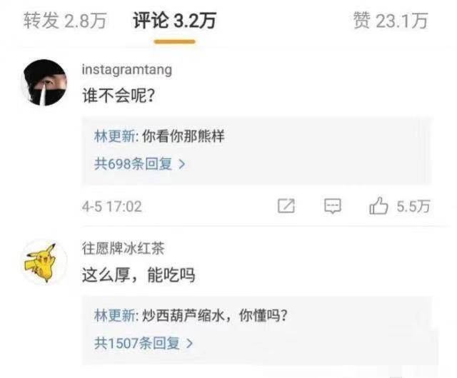 今天小编就带大家来看看林更新是怎么实力宠粉的,没有一点明星的架子,真的是完全把粉丝宠坏了。在闲暇之余,小编翻到了林更新的微博,关注的人都知道,他经常会在微博中晒出自己的日常,对于粉丝来说这种习惯当然最好不过了。因为有些爱豆很难得才更新一次微博,并且还是做宣传。然而吸引小编的并不是林更新的微博内容,更多的还是粉丝们的评论。话不多说,咱就直接上图,这个就是过度宠粉的结果,爱豆想要个表情包,结果呢?这是什么表情包?