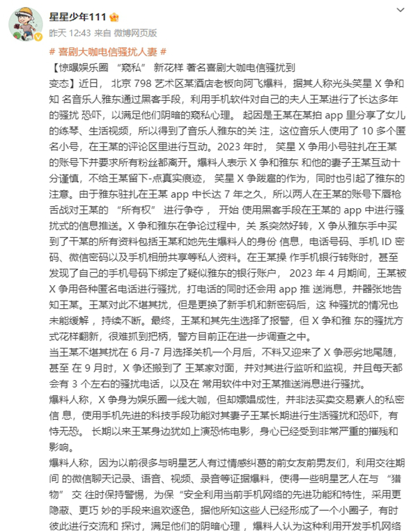 起因是王某在某拍 app 里分享了女儿的练琴、生活视频,所以得到了音乐人雅东的关注,这位音乐人使用了10多个匿名小号,在王某的评论区里进行互动。2023年时, 笑星 X 争用小号驻扎在王某的账号下并要求所有粉丝都离开。爆料人表示 X 争和雅东和他的妻子王某互动十分谨慎,不给王某留下-点真实痕迹, 笑星 X 争跋扈的作为,同时也引起了雅东的注意。由于雅东驻扎在王某 app 中长达 7 年之久,所以两人在王某的账号下唇枪舌战对王某的 “所有权” 进行争夺 , 开始使用黑客手段在王某的 app 中进行骚扰式的信息推送。X 争和雅东在争论过程中,关系突然好转,X 争从雅东手中买到了王某的所有资料包括王某和她先生爆料人的身份信息,电话号码、手机 ID 密码、微信密码以及手机相册共享等私人资料。在王某操作手机银行转账时,甚至发现了自己的手机号码下绑定了疑似雅东的银行账户, 2023年4月期间,王某被 X 争用各种匿名电话进行骚扰,打电话的同时还会用 app 推送消息,并器张地告知王某。王某对此不堪其扰,但是更换了新手机和新密码后,这种骚扰的情况也未能缓解 ,持续不断。最终,王某和其先生选择了报警,但 X 争和雅东的骚扰方式花样翻新,很难抓到把柄,警方目前正在进一步调查之中。