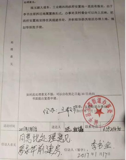 “在我绝望无助的情况下想到党和国家加强依法治国,老百姓利益至上,想到法律的公平,我含泪把我的真实情况和冤屈信访至县领导(要求赔偿我经济损失和精神损失,并在原来的位置把房屋建好)县领导高度重视当即批示至玉都办事处和城管局解决此事。”冬梅说。