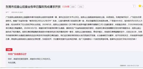 2020年9月23日,观音山公园员工在人民网“领导留言板”给现任广东省委书记李希留言,希望领导关注并尽快敦促东莞市相关部门开放观音广场,让观音山国家森林公园恢复正常经营。
