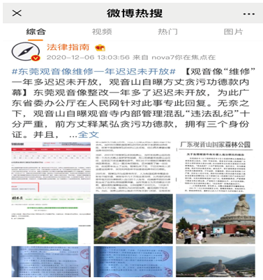 2020年12月6日,微博热搜榜上出现话题#东莞观音像维修一年多迟迟未开放,个中原因究竟为哪般?#,引起众多网友猜测:一个好好的生态文化旅游景区,为何东莞当地政府某些人就容不下呢?本来观音菩萨救苦救难,教人向善,可保国泰民安的,为何这尊观音像要被围挡一年多,不让游客朝拜?
