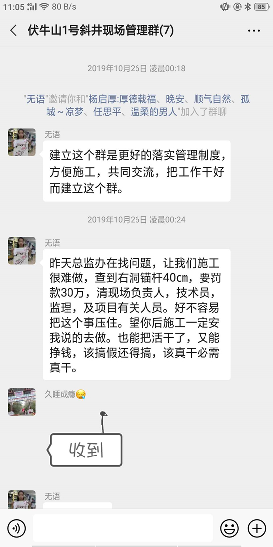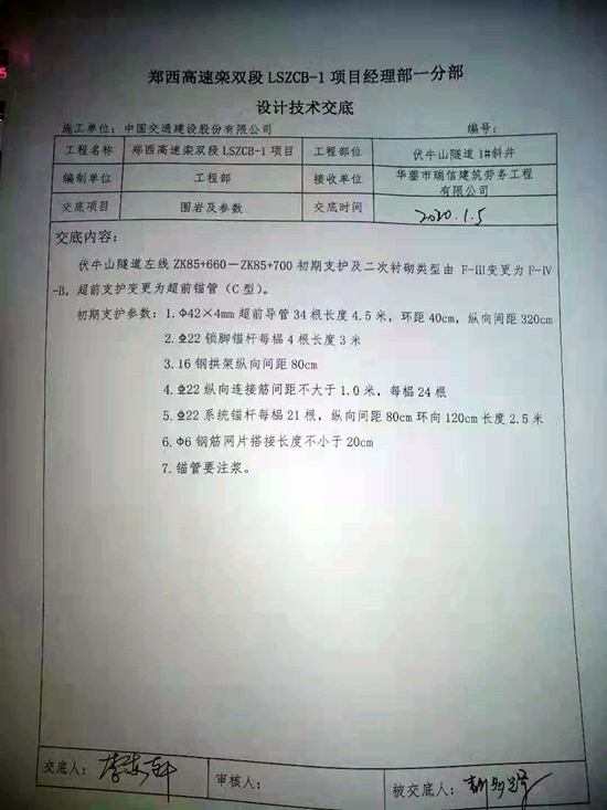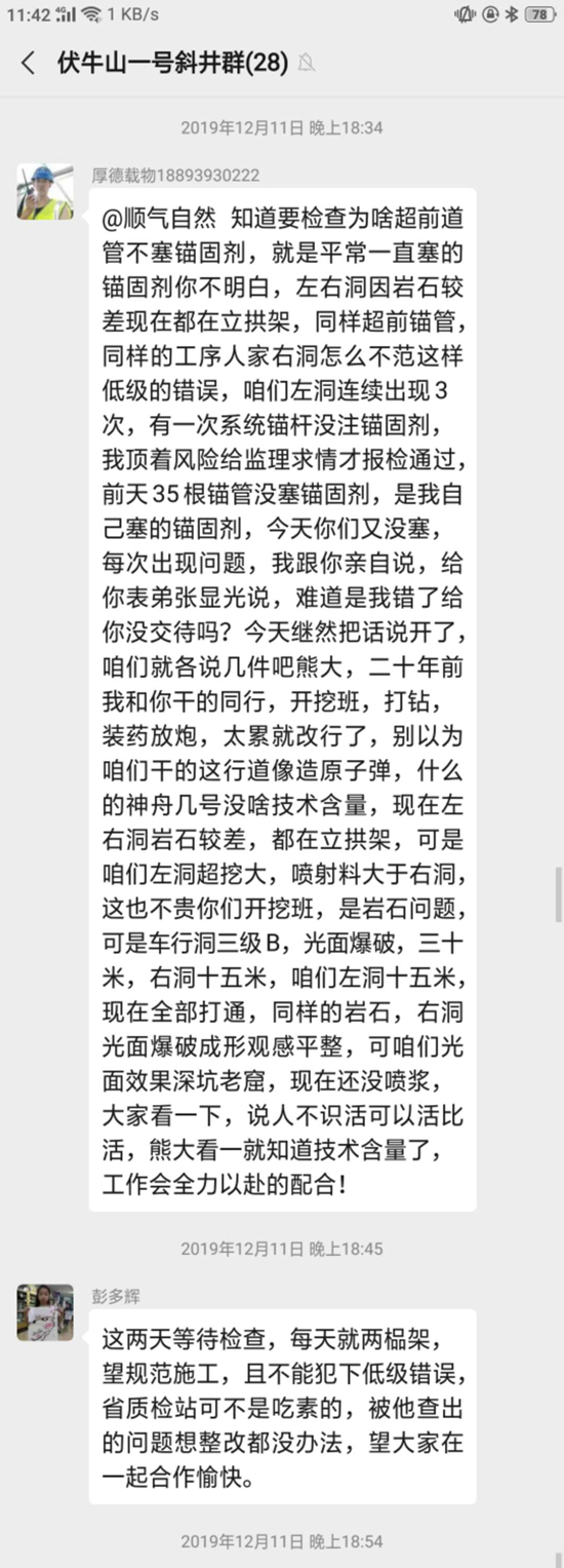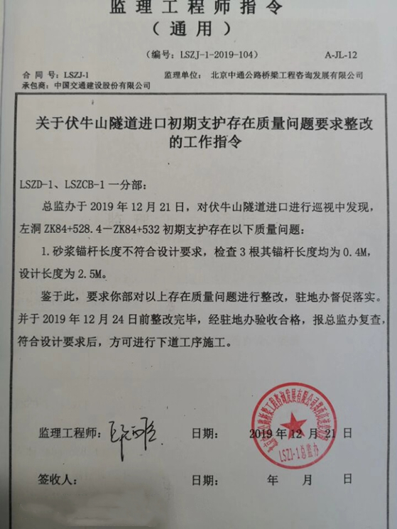 阮绪明说,他的施工队伍共计75人,2018年3月进场25人,至12月,华蓥瑞信也按时付清工人工资。2019年正月75名农民工全部进场,先期打进的400米隧道,华蓥瑞信强行要求施工队将图纸规定的锚杆打2.5米深度只打30公分。超前锚杆规定4.5米深,而实际只打1.5米,工程监理发现其工程出现严重质量问题,要求所有施工单位严格整改……有时监理查的紧了,华蓥瑞信就要求按规定打深度应付一下 ……