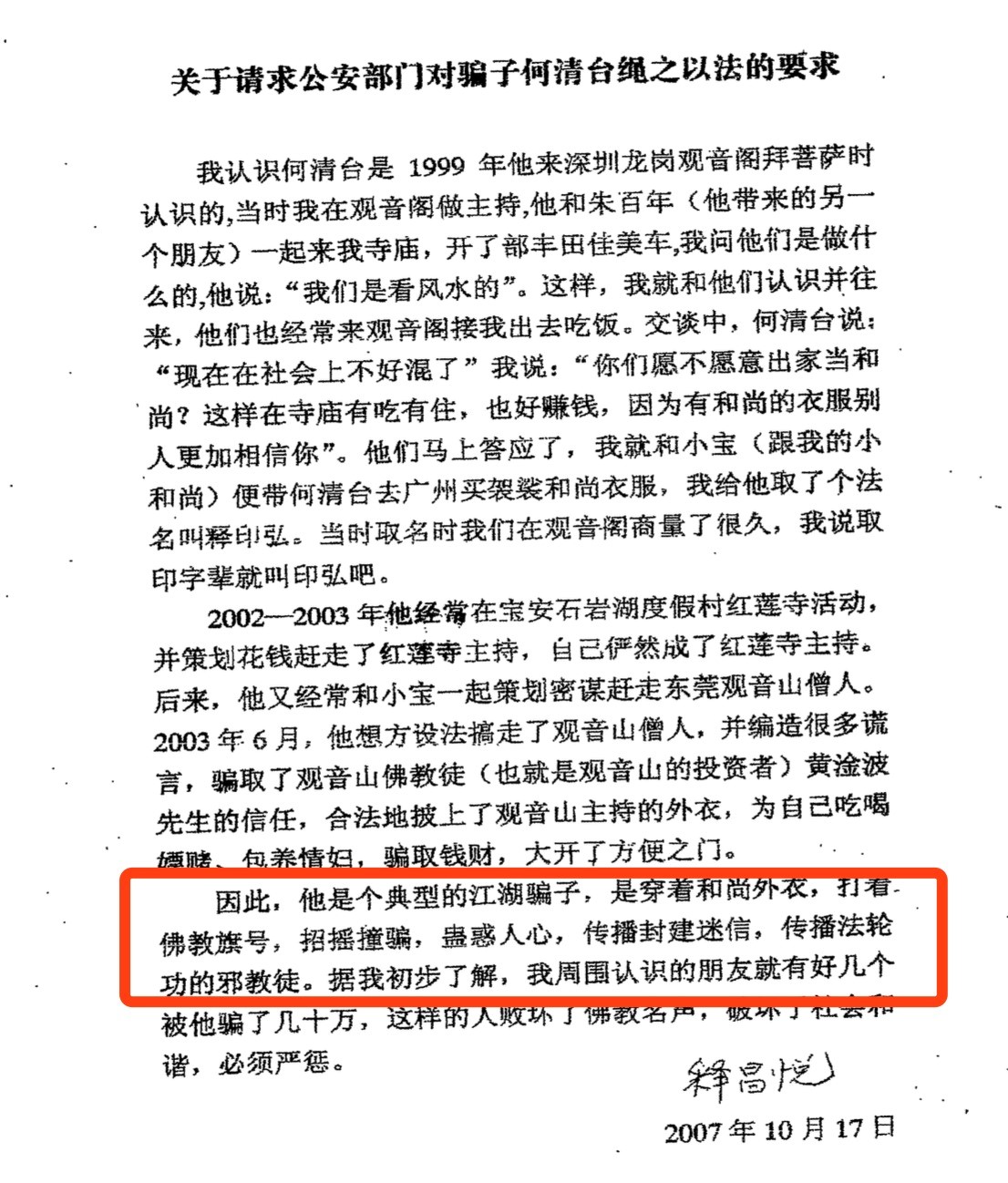2007年,假印弘因长期贪污功德款被举报到东莞市民宗局和观音山管委会。东莞市民宗局无动于衷,没有采取任何调查等措施。观音山管委会在了解情况后上报给中央统战部,因为有本老及很多人作证,证明这个假印弘是假和尚,是冒充本老弟子的,所以统战部就命令要把假印弘开除出佛教协会,不能让他再当和尚。2008年6月,假印弘被免去观音寺住持。