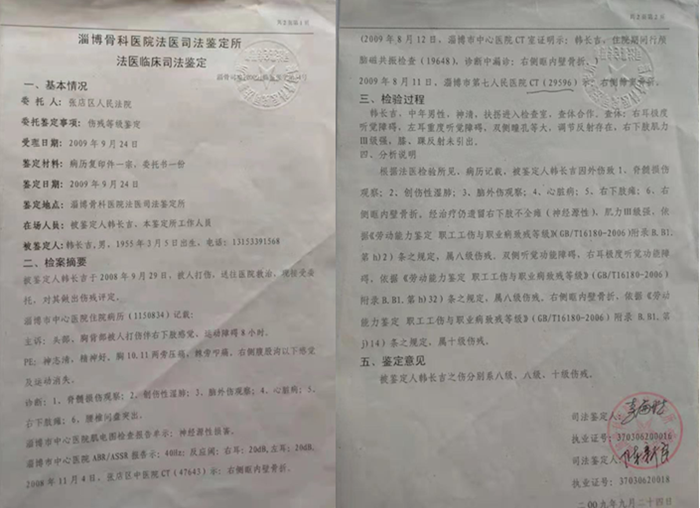 他万万没想到,自己非常健康的身体,如今被韩致勇报复打成了残疾人,区公安局法医故意拖了这么久才做的伤情鉴定,竟然是伤情不适宜进行轻重伤评定。他转向法院起诉了韩致勇。2009年9月24日,张店区法院指定淄博骨科医院法医司法鉴定所,为他作出法医临床司法鉴定结果:“1.脊髓损伤观察,2.创伤性湿肺,3.脑外伤观察,4.心脏病,5.右下肢瘫(神经源性),根据国家相关规定属八级伤残。6.右耳极度听觉功能障碍,属于八级伤残。7.右眼眶内壁骨折,属十级伤残”。虽然法院给评定了伤残,如果想追究韩致勇的刑事责任,还必须到公安部门做伤情鉴定才行。