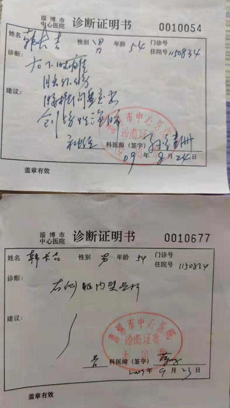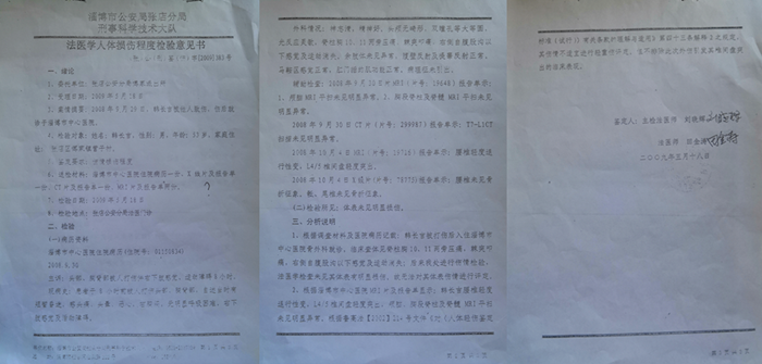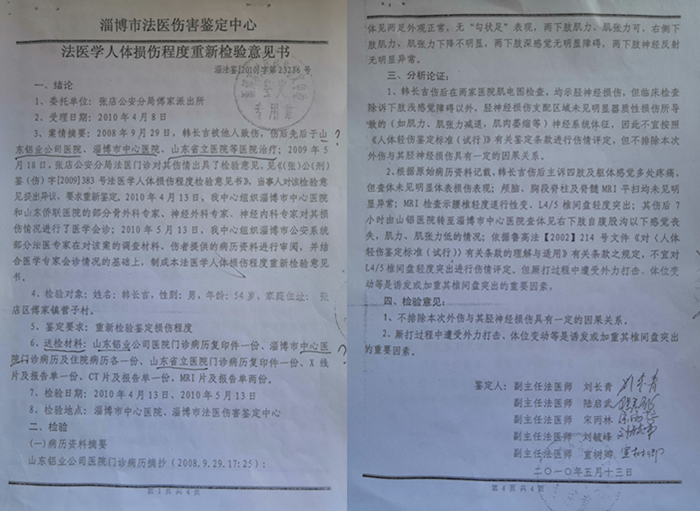 为了维护自己的合法权益,他先后到省纪委、省市区各级信访部门进行上访,写实名举报信。迫于信访的压力,淄博市法医伤害鉴定中心为他出具了法医学人体损伤程度重新检验意见书(淄法鉴【2010】字第23236号)。但是,韩长吉认为,淄博市公安局刑警支队法医队副大队长刘长清,伙同其他四名法医,故意将他右腿被打成神经源性瘫痪的原因,定性为腰椎间盘突出造成的,并且只字不提右眶内壁骨折这个伤情,刻意不采信中医院、骨科医院法医的检查结果,以及中心医院的漏诊诊断书及漏诊证明,因为这些都记载了他右侧眶内壁骨折这个事实。