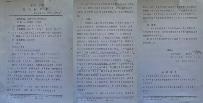 这两份会诊报告足以证实,他被韩致勇打伤致残的确凿证据。但令他没想到的是,这两份报告必须由市法医和派出所的民警一起送到省物证鉴定中心才行,他自己送去不受理。在他多次请求下,市、区法医也始终不去送。2010年8月23日,山东省公安厅出具了鲁公物鉴(法)字【2010】(275)号物证报告书。由于缺乏这两份确凿的证据,因此,没法公正的作出真实公平的鉴定结果。