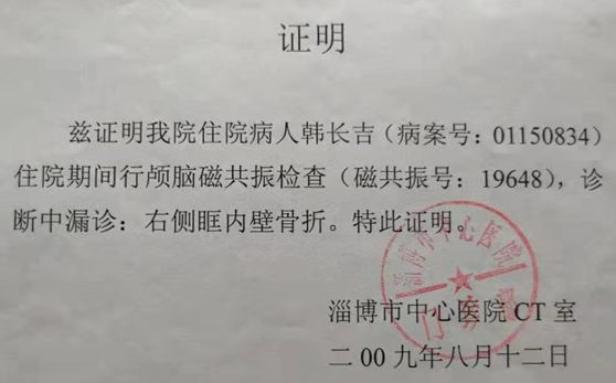 韩长吉说:由于韩志勇托了关系,淄博市中心医院将他赶出了医院。他只好到张店区中医院继续治疗,中医院在对他做入院检查时,又检查出右眼眶内侧骨折。在住院治疗期间,傅家镇派出所给他开具了伤情鉴定通知书。他多次到淄博市中心医院的伤情鉴定门诊,请求做伤情鉴定,但区公安分局法医刘晓辉,始终以各种理由拖着就不给做。他被逼无奈进行逐级上访。区公安分局迫于上级的压力,在距案发九个多月的时候,为他做了伤情鉴定。淄博市公安局张店分局刑事科学技术大队,法医学人体损伤程度检验意见书([张]公[刑]鉴[伤]字【2009】383号)载明:“其伤情不适宜进行轻重伤评定”。但区主检法医刘晓辉,在这第一份伤情鉴定书里,并没有采信中医院作出的检查结果。