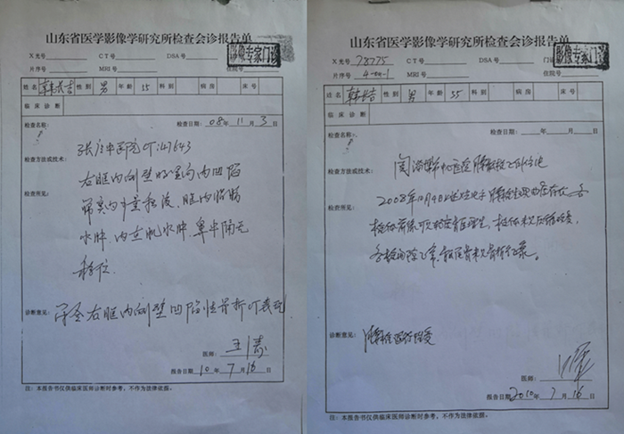 无奈之下,他选择到省里继续上访。2010年7月13日,淄博市公安局刑警支队,派耿国栋、王京博两名警察和他一起前往山东省公安厅做伤情鉴定。他向物证中心递交了证据材料,省主任法医师董洪旺,要求他到山东省医学影像学研究所检查会诊。2010年7月16日,经过该单位影像专家的认真审查后,两位专家告诉他:1.腰椎退行性变,但右腿神经源性瘫痪不是腰椎压迫神经造成的。2.符合右眶内侧壁凹陷性骨折CT表现。