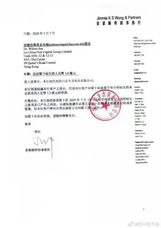 据悉,席春迎于2015年10月14日向宏丰吉借款1.5亿元,并称用于资本运作,宏丰吉于2015年11月4日按席春迎指定的深圳景华荣翔投资管理有限公司(以下简称“景华荣翔”)账户汇款1.5亿元。此后,宏丰吉因席春迎经营的首控集团被申请清算,开始对席春迎之前的借款行为及偿债能力产生怀疑。遂在2020年7月7日委托香港黄嘉锡律师事务所向席春迎发送《催款函》,但在之后的6个多月的时间里,席春迎并没有作出任何回复,包括电话、信息、邮件等也都联系不上。
