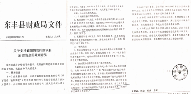 2013年6月13日,东丰县财政局办公室《关于支持鑫阳陶瓷纤维项目所需资金的处理意见》;