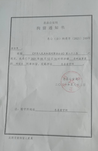 (维权网信息中心报道)2021年5月18日,本网获悉:今天上午,河南省信阳市维权人士邢望力的妻子徐金翠前往息县淮河派出所首次接收邢望力刑事拘留通知书,确认邢望力涉嫌“寻衅滋事罪”羁押于息县看守所。