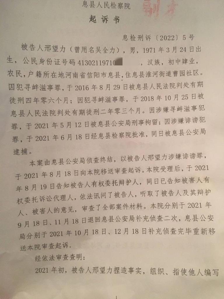 2022年4月5日,本网获悉:中共当局指控河南省信阳市维权人士邢望力涉嫌“诽谤罪”一案将于2022年4月7日(本周四)上午9点在息县法院公开开庭审理。