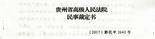环宇公司不服黔南州中级人民法院的判决,又申诉到贵州省高级人民法院,高级人民法院雷勇审判长也是在没有与环宇公司人员咨询的情况下,以一审、二审都没有给予(重新评估申请)、以环宇公司虽然觉得评估机构评估价格过高(但没有书面要求重新评估并当庭申请)为由,下了维持原判的裁定书。