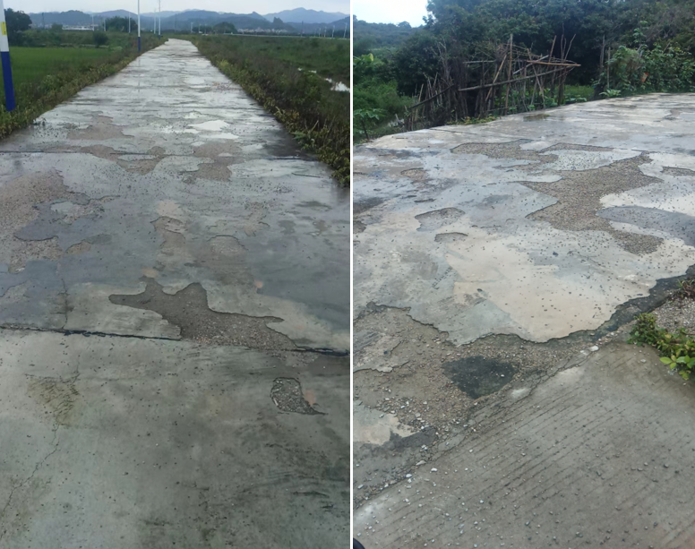 乌石村禾塘嘴段河堤路面硬化工程是水利民生工程,2018年10月动工兴建,刚建好就出现裂缝和破碎,属豆腐渣工程,原因是水泥标号严重不达标,利用石粉倒路,验收时用水泥油刷并遮盖爆裂路面,众多村民质疑造假通过验收。(见上图)