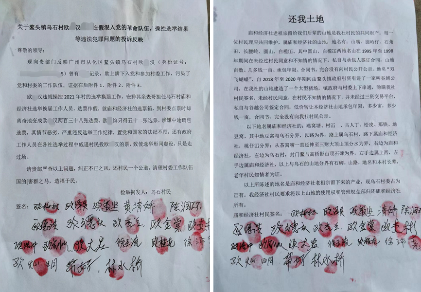 2022年中央一号文件指出,突出实效改进乡村治理,加强农村基层组织建设,创新农村精神文明建设有效平台载体,切实维护农村社会平安稳定。我国进入第十四个五年规划以来,农村经济改革进入了关键时期,广大农村的经济繁荣,对我们国家尤为重要。我们知道,只有农村富裕了,我们的国家才算真正富强了。 可是,有一些村子,一些人却背道而驰。个别自私自利的人,罔顾国家利益,损公肥私,挖集体墙角,侵害国家、人民生命财产安全。为此,国家出台了平安乡村建设工程,开展新一轮的农村整治工作,对一些不合格的村干部坚决清理出干部队伍。 近日,媒体接到广东省广州市从化区鳌头镇乌石村众多村民反映:“乌石村现任村支书欧某汉引发众多村民不满,村民提供了欧某汉涉嫌违法违规多条线索,恳请上级有关部门、领导核实、调查。” 一、鳌头镇乌石村众多村民提供的线索