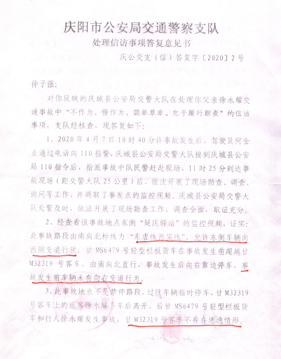 “我父亲徐某耀在2020年4月7日发生的一起道路交通事故中被撞成重伤,经抢救无效身亡,被认定与肇事货车驾驶人承担同等责任。申请人对被申请人庆阳市交警支队2020年6月2日作出的庆公交支(信)答复字(2020)2号《信访事项答复意见书》不服,特申请复查。”甘肃省庆城县庆城镇居民徐某强致函有关部门,要求撤销庆公交支(信)答复字(2020)2号《信访事项答复意见书》;同时撤销庆城县交警大队作出的第622821120200000015号《道路交通事故认定书》、庆阳市交警支队作出庆公交复字结论(2020)第000020号《道路交通事故复核结论》,依法重新调查本起道路交通事故,查明事实真相,准确认定事故各方责任。