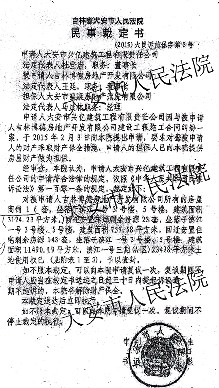 房产被扣押后,材料商们感到不平,开始调查滨江一号的问题并逐级向上反映。调查中,住建局相关负责人曾经向他们确认,兴亿公司在向法院申请查封时提供的担保涉嫌造假,住建局下属单位从来没有给其提供担保。他们还发现,作为建筑商的兴亿公司是一个“冒牌货”,竟然冒用内蒙古赤峰市亚殿建筑工程有限公司(以下简称亚殿公司)的资质施工。之后,他们又到公安部门报案,亚殿公司也给大安市公安局出具了情况说明,但是至今,警方并没有立案,而大安市住建局对此的回应竟是“这是上届领导的错,与现任无关”。在材料商们不断上访反映问题和住建局介入后,大安市法院暂时停止了对抵顶房屋的执行,但是彻底解决滨江一号的问题似乎还遥遥无期。