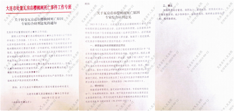 这次采集的样本,也同时检测了总铜含量,而且检出来的铜含量并不低,但对于为何会排除铜离子药害,则完全没有解释。在整个研判过程中,专家组自始自终没有询问农户打药情况,没有查看药单。研判工作结束后,大连市、区两级农业农村局给相关农户出具了一份纯A4纸打印、没有盖章和任何专家签字的所谓“研判意见书”,从此不再处理和回应农户们关于樱桃树死亡的任何诉求。