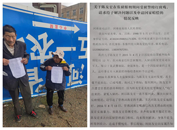 据网上流传的一份“情况反映书”指控,陈友宏本是退伍军人,被诬陷抢劫罪重判12年。2016年8月13日,在信阳监狱十监区二队服刑期间,被管教润海宏殴打致残,家人控监时发现他的手臂不能抬起,也未得到及时救治。家人多次上访久拖不决。